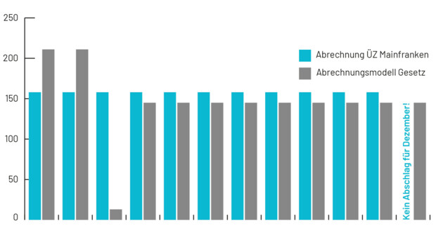 Wir haben uns jedoch dazu entschieden, bereits ab Januar nur einen reduzierten Abschlag unter Berücksichtigung der Strompreisbremse zu berechnen, damit für Sie keine Mehrbelastung im Januar und Februar entsteht. Das heißt: ÜZ-Kunden bezahlen von Januar-November elf gleichmäßig reduzierte Abschläge - der Dezember ist bei uns wie gewohnt abschlagsfrei.