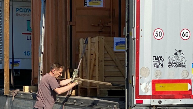 Nachdem alle Hilfsgüter aufgeladen wurden, hat der Fahrer die Aggregate noch gesichert, damit alles unbeschadet in der Ukraine ankommt.