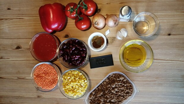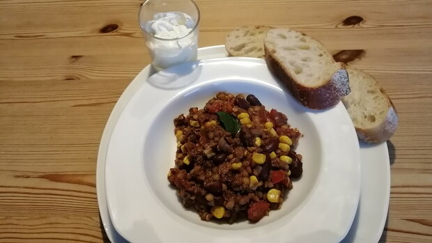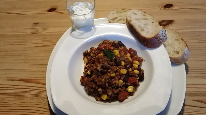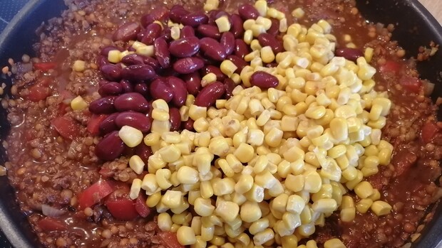 Mais, Kidneybohnen und alternativ das Soja-Hack hinzufügen. Alles nochmal kurz aufkochen lassen.
