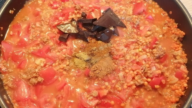 Mit Chilipulver, Chiliflocken, Paprikapulver, Kreuzkümmel, Zimt, Zucker, Salz und Pfeffer nach Geschmack würzen.