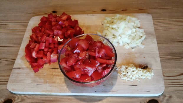 Zwiebeln und Knoblauch schälen und fein würfeln. Paprika und Tomaten waschen und ebenfalls würfeln.