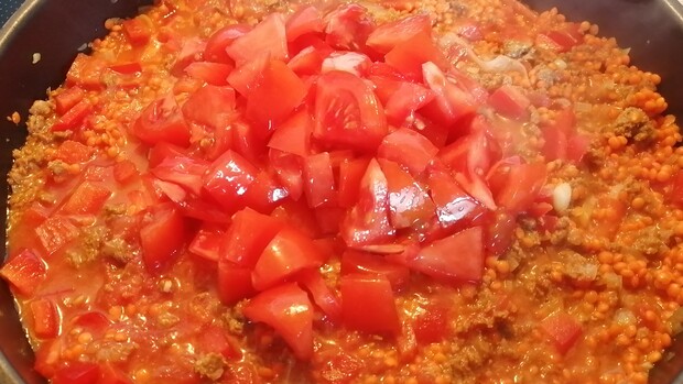 Anschließend die geschnittenen Tomaten hinzufügen und das Ganze ein paar Minuten unter Rühren köcheln lassen.