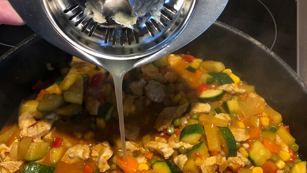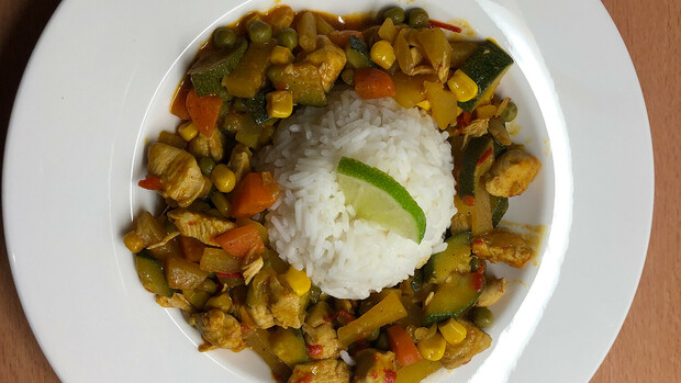 Nun mit Salz, Pfeffer und einem Teelöffel Curry würzen. Im Anschluss geben Sie das geschnittene Gemüse dazu und braten alles zusammen für weitere 10 Minuten auf an.