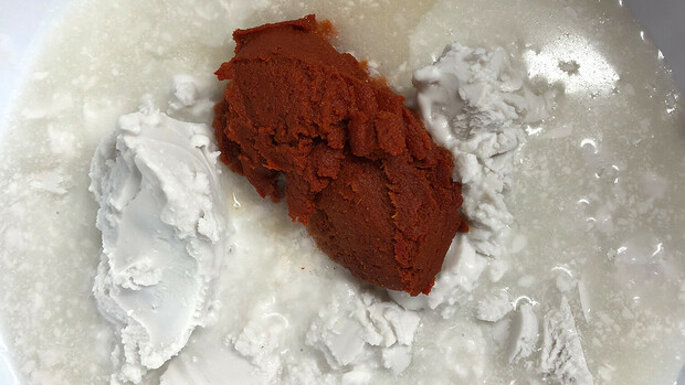 Geben Sie die Kokosmilch in eine Schüssel und vermengen diese mit der Currypaste bis keine größeren Stückchen mehr zu sehen sind. UNSER TIPP: Rühren Sie mit einem Schneebesen.