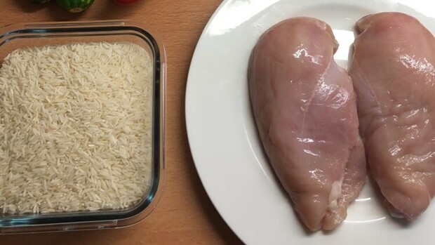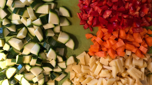 Schneiden Sie die Zwiebeln, Hähnchenbrüste und das frische Gemüse klein.