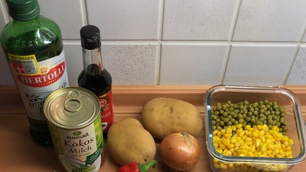 Nachdem alles schön angebraten ist, geben Sie das Dosengemüse, also den Mais und die Erbsen, hinzu. Nun nochmal alles 3 Minuten anbraten.