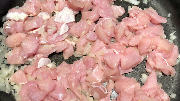 Nun das Olivenöl in einer großen Pfanne oder einem Bräter erhitzen und die kleingeschnittenen Zwiebeln darin andünsten bis diese glasig sind. Danach geben Sie die Hähnchenwürfel dazu und braten es solange bis es durch ist.