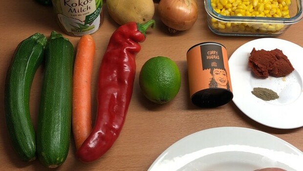 Löschen Sie mit dem Kokosmilch-Currypasten-Gemisch ab und schmecken mit der Sojasoße, dem übrig gebliebenen Teelöffel Curry und dem Limettensaft Ihr Gericht ab. Das Thai-Curry für mindestens 10 Minuten auf niedrigster Stufe köcheln lassen.