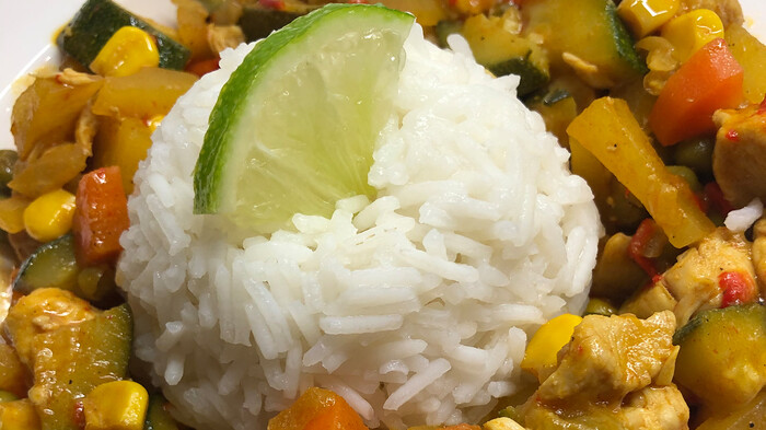 Nachdem der Reis fertiggekocht ist, geben Sie ihn in eine kleine Tasse und stürzen diese auf einen Suppenteller. Zum Schluss das fertig gekochte Thai-Curry außen herum verteilen und nach Belieben mit einem Stück Limette verzieren.