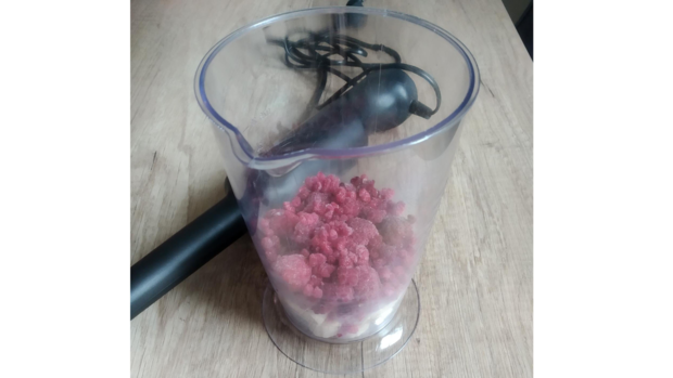 Bananen und Himbeeren für ca. 10-15 Minuten antauen lassen. Ein paar Himbeeren oder Bananen für die Deko aufbewahren.