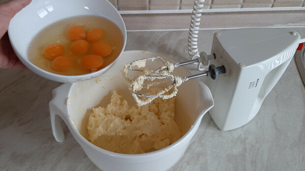 Butter und Zucker schaumig rühren, nach und nach die Eier hinzugeben und für drei Minuten zu einer glatten Masse verrühren. Danach das Mehl und das Backpulver hinzufügen und kurz unterrühren.