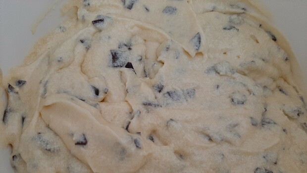 Nun den Teig in zwei Hälften aufteilen. Unter die erste Hälfte die gemahlenen Haselnüsse geben. Die Schokoladenraspeln verfeinern die zweite Teighälfte.