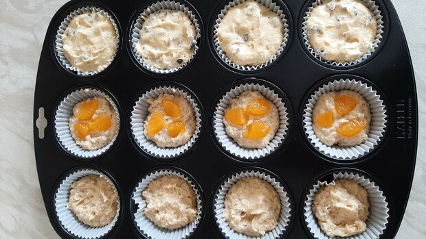 Die Muffin-Backbleche mit Papierförmchen auslegen und bis zur Hälfte mit dem Haselnussteig füllen. Jetzt kommen die Mandarinen aus der Dose drauf, ca. 3 Stück pro Muffin. Zum Schluss die Förmchen mit dem zweiten Teig auffüllen.